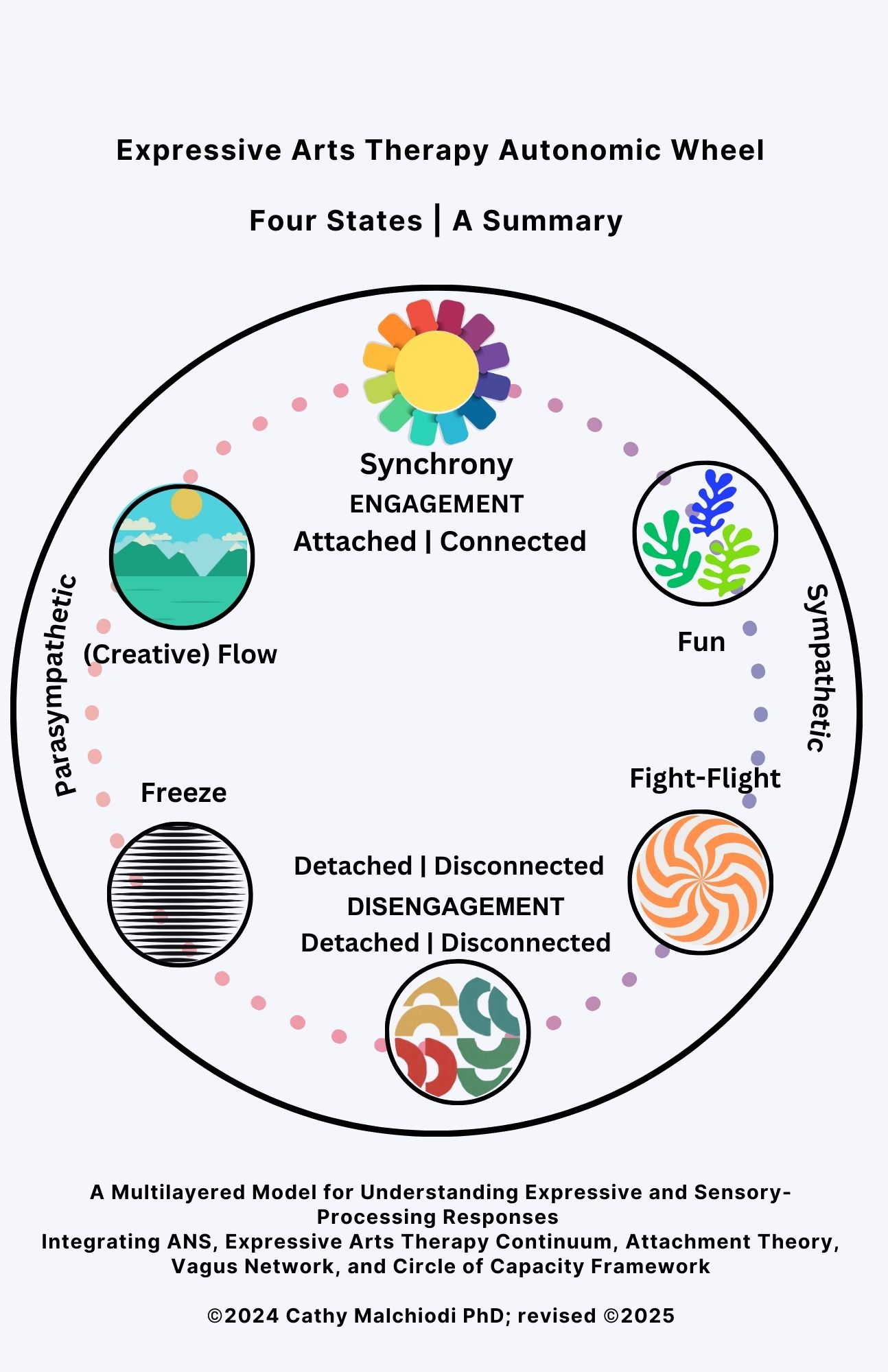Core Principles in this course include: the MSSS Model of Expressive Arts Therapy; the Circle of Capacity and Restorative Embodiment through expressive arts practices; S.A.G.E.--Synchrony, Attunement, Grounding, and Engagement in supporting healthy attachment; and the Expressive Arts Therapy Autonomic Wheel, emphasizing the importance of capacity-building experiences in therapy that reinforce joy, enlivenment, mastery, self-agency, and creativity as restorative experiences.
